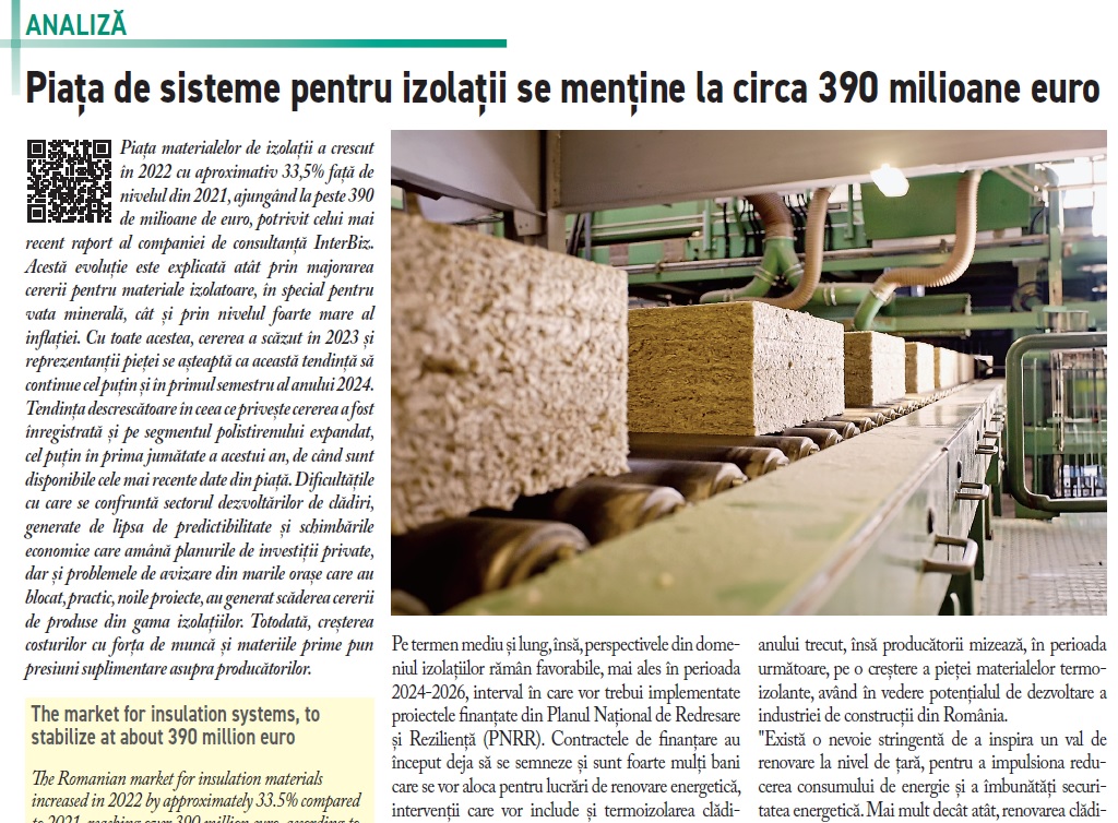 In continuare, este publicata Analiza pietei locale de izolatii, evaluata la circa 390 de milioane de euro, potrivit celor mai recente cercetari din domeniu. Materialul porneste de la principalele repere ale pietei locale de termoizolatii in anul 2022, conform studiilor existente pe piata si datelor furnizorilor specializati, si include previziuni privind dezvoltarea sectorului in 2023 si in perspectiva, avand in vedere contextul general marcat de obligativitatea construirii de cladiri NZEB, dar si a proiectiilor de renovare a fondului de cladiri pentru a corespunde noilor criterii de eficienta energetica, pana in 2030/2050. Analiza mai include date specifice referitoare la segmentele de polistiren expandat, vata minerala bazaltica si de sticla, datele fiind intarite de opinii ale reprezentantilor pietei de termoizolatii: