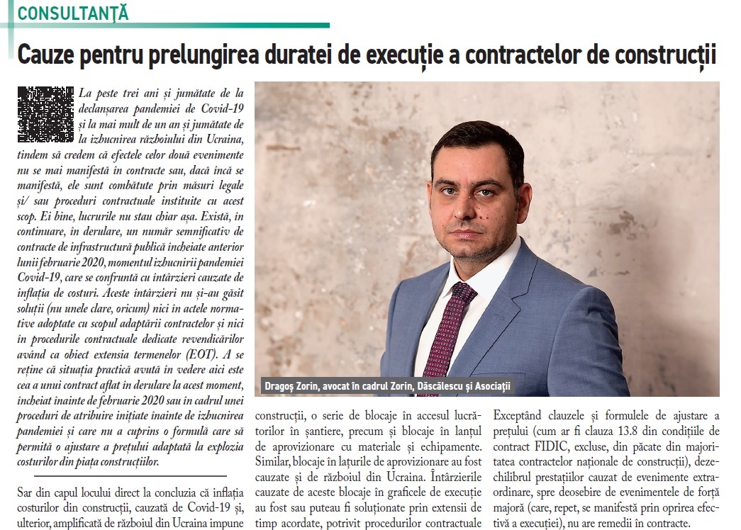 La rubrica de Consultanta sunt prezentate patru articole pe diverse teme de actualitate. Primul material este realizat de Dragos Zorin, avocat in cadrul Zorin, Dascalescu si Asociatii, si trateaza principalele cauze pentru prelungirea duratei de executie a contractelor de constructii. Cel de-al doilea articol, realizat pe baza unor comunicari stiintifice ale companiei de arhitectura si inginerie Gensler, care defineste noi standarde de sustenabilitate pentru produsele pe care le propune la fiecare dintre obiectivele pe care le realizeaza. Standardele Gensler pentru sustenabilitatea produselor (GPS) v1.0 stabilesc criterii de performanta in materie de dezvoltare durabila pentru primele 12 categorii de produse cel mai frecvent utilizate, care exercita un impact ridicat din acest punct de vedere si care sunt cel mai des selectate pentru proiectele de arhitectura si design interior.