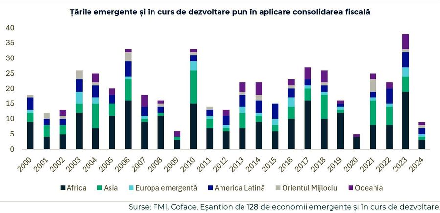 Austeritatea in Europa emergenta tinde sa se bazeze mai mult pe reducerea cheltuielilor. Totusi, in toate regiunile, consolidarea fiscala combina de obicei atat cresterea veniturilor, cat si reducerea cheltuielilor. In ceea ce priveste tulburarile sociale, definite ca fiind aparitia unor evenimente precum proteste de strada, revolte, demonstratii majore si alte forme de tensiuni interne, Europa Emergenta nu a inregistrat astfel de evenimente 2 ani la rand (2023 si 2024), marcand o perioada de calm.