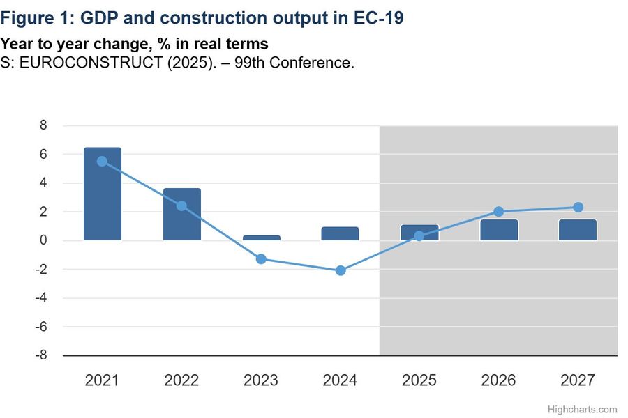 Majoritatea factorilor de influenta sunt indreptati catre cresterea productiei de constructii in urmatorii ani. Pe aceasta baza, Euroconstruct previzioneaza ca, dupa scaderea din ultimii doi ani, in 2025 tendinta descendenta va fi intrerupta, iar productia de constructii din zona Euroconstruct va creste cu 0,3%. Prognoza pentru anii urmatori (2026-2027) indica o crestere medie anuala de aproximativ 2%.