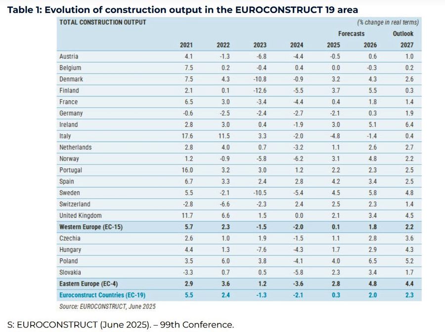 Dinamica actuala si scenariul pe termen scurt pentru sectorul constructiilor din Europa in perioada 2025-2027 vor fi influentate de o usoara imbunatatire a situatiei economice. Cu toate acestea, exista in continuare o incertitudine ridicata cu privire la consecintele negative multiple ale razboiului din Ucraina si la modificarile tarifelor SUA. Socul inflationist cauzat de izbucnirea razboiului din Ucraina se diminueaza treptat, iar perspectivele economice generale sunt pozitive. Scaderea inflatiei a imbunatatit conditiile de finantare a constructiilor, ca urmare a scaderii ratelor dobanzilor, a cresterii bonitatii investitorilor si a lansarii finantarii investitiilor din partea UE. Acestea sunt cateva dintre concluziile si estimarile realizate in cadrul celei mai recente conferinte Euroconstruct, ce a avut loc la Varsovia pe 6 iunie 2025, fiind gazduita de PAB PCR&F.Cele 19 tari monitorizate de Euroconstruct sunt Austria, Belgia, Danemarca, Finlanda, Franta, Germania, Irlanda, Italia, Olanda, Norvegia, Portugalia, Spania, Suedia, Elvetia, Marea Britanie, Cehia, Ungaria, Polonia si Slovacia si genereaza aproximativ 95% din valoarea pietei europene de constructii.