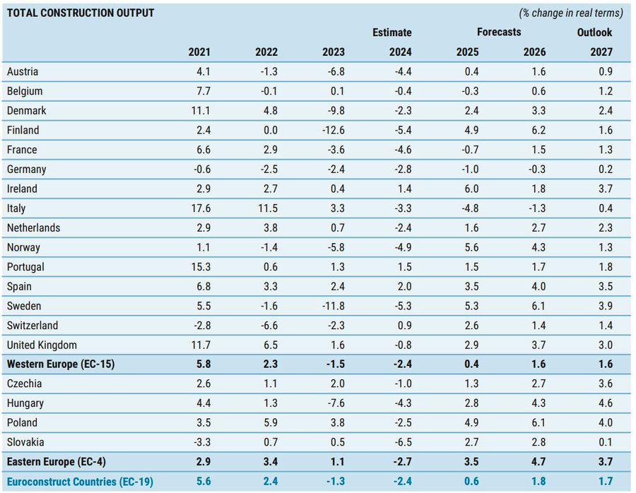 Piata europeana a constructiilor traverseaza o perioada provocatoare, marcata de mentinerea unor factori perturbatori externi, precum razboiul din Ucraina, dar si de efectul posibilelor schimbari in politica SUA. La acestia se adauga o serie de factori interni, precum mentinerea ratelor ridicate ale dobanzilor si costurile in crestere cu energia si cu forta de munca, care impiedica activitatea de constructii si planurile de investitii. Dupa contractia pietei din 2023, 2024 a fost cel mai dificil an pentru industrie din ultimele doua decenii si jumatate. Cu toate acestea, prognozele indica o revenire pe un trend pozitiv incepand cu 2025.Potrivit celor mai recente estimari, activitatea de constructii din cele 19 tari monitorizate de Euroconstruct va inregistra un declin de 2,4% in 2024, o usoara revigorare (+0,6%) fiind estimata pentru 2025. Evolutia crescatoare este prognozata sa continue si in 2026 si 2027.