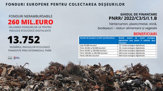 In baza apelului de proiecte PNRR/ 2022/C3/S/I.1.B, primarii pot accesa bani gratuiti pentru a rezolva problema deseurilor prin instalarea unor „insule ecologice digitalizate” - adica puncte de colectare a deseurilor la nivelul comunitatilor, cum sunt platformele subterane, semiingropate sau supraterane.