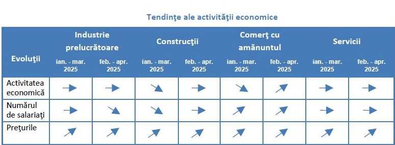 Ca tendinte economice generale, documentul statistic indica, pentru perioada februarie - aprilie 2025, o relativa stabilitate a activitatii economice in industria prelucratoare, constructii si servicii, precum si noi cresteri de preturi in toate domeniile de activitate ale economiei. In cadrul anchetei de conjunctura din luna ianuarie 2025, managerii din industria prelucratoare previzioneaza pentru urmatoarele trei luni, relativa stabilitate a volumului productiei (sold conjunctural -5%). Referitor la numarul de salariati se estimeaza relativa stabilitate, soldul conjunctural fiind de -4%. Pentru preturile produselor industriale se prognozeaza crestere in urmatoarele trei luni (sold conjunctural +30%).