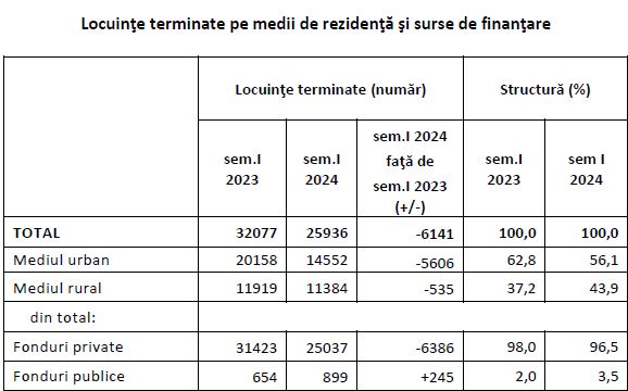 Pentru trimestrul al doilea al anului 2024, datele INS indica o scadere cu 2.172 de unitati a numarului de locuinte date in folosinta, in raport cu nivelul din perioada corespunzatoare din 2023, pana la 14.576 de locuinte. Pe medii de rezidenta, cele mai multe locuinte au fost construite in mediul urban (57,7%), in timp ce numarul locuintelor realizate din fonduri private a scazut cu 2.508 unitati si a crescut numarul celor din fonduri publice, cu 336 de unitati. Distributia in profil regional, in trimestrul al doilea al acestui an, comparativ cu aceeasi perioada din 2023, evidentiaza scaderi a numarului locuintelor terminate in urmatoarele regiuni de dezvoltare: Bucuresti-Ilfov (-680 locuinte), Sud-Est (-669), Sud-Muntenia (-275), Centru (-264), Nord–Vest (-143), Nord-Est (-138) si Vest (-100). Cresteri ale numarului de locuinte terminate s-au inregistrat intr-o singura regiune de dezvoltare si anume in Sud–Vest Oltenia (+97 locuinte).