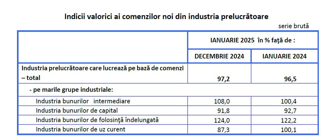 In luna ianuarie 2025, comenzile noi din industria prelucratoare pe total (piata interna si piata externa) au scazut, in termeni nominali, atat fata de luna decembrie 2024, cu 2,8%, cat si fata de ianuarie 2024, cu 3,5%, potrivit celor mai recente date publicate de Institutul National de Statistica (INS).Scaderea de 2,8% inregistrata in ianuarie 2025 comparativ cu luna precedenta a fost generata de diminuari consemnate in industria bunurilor de uz curent (-12,7%) si in cea a bunurilor de capital (-8,2%), in timp ce cresteri au inregistrat industria bunurilor de folosinta indelungata (+24%) si cea a bunurilor intermediare (+8%).