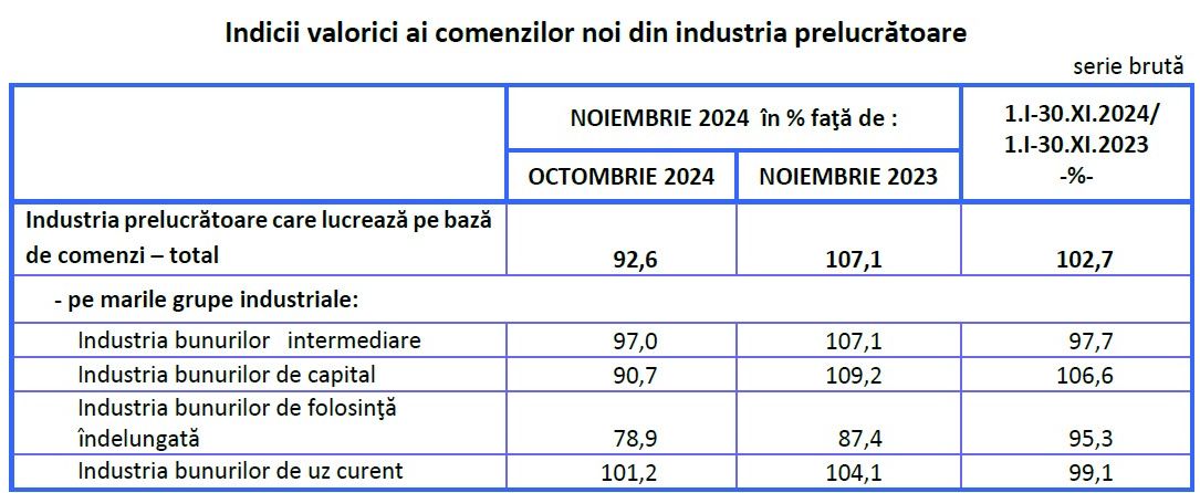 In luna noiembrie 2024, comenzile noi din industria prelucratoare, pe total (piata interna si externa), au scazut in termeni nominali, fata de luna octombrie 2024 cu 7,4%, iar fata de luna noiembrie 2024 au crescut cu 7,1%. In perioada ianuarie - noiembrie 2024, comparativ cu intervalul corespunzator din 2023, comenzile noi din industria prelucratoare, au crescut, in termeni nominali, cu 2,7%, potrivit Institutului National de Statistica (INS).Comenzile noi din industria prelucratoare au scazut, in termeni nominali, in luna noiembrie 2024, comparativ cu luna precedenta, pe ansamblu, cu 7,4% ca urmare a scaderilor inregistrate in industria bunurilor de folosinta indelungata (-21,1%), industria bunurilor de capital (-9,3%) si in cea a bunurilor intermediare (-3%). Industria bunurilor de uz curent a crescut cu 1,2%.
