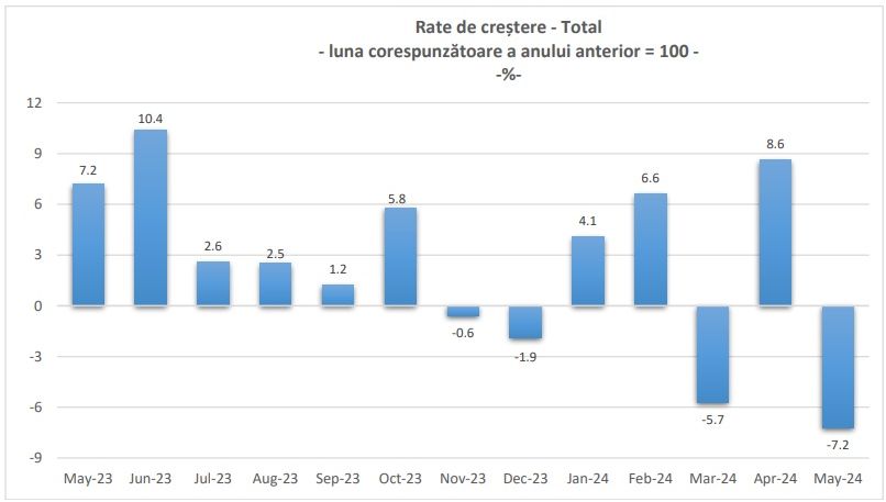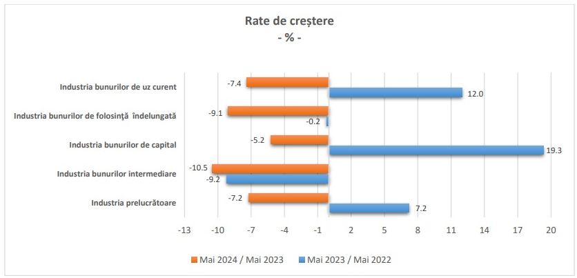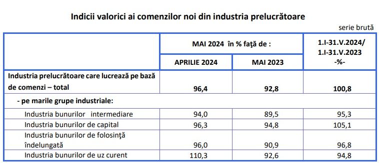 Comenzile noi din industria prelucratoare, au scazut in termeni nominali, in luna mai 2024, comparativ cu luna precedenta, pe ansamblu, cu 3,6%, ca urmare a scaderilor inregistrate in industria bunurilor intermediare (-6%), industria bunurilor de folosinta indelungata (-4%) si in industria bunurilor de capital (-3,7%), arata cele mai recente date transmise de Institutul National de Statistica (INS). Industria bunurilor de uz curent a crescut cu 10,3%.Comenzile noi din industria prelucratoare, au scazut in termeni nominali, in luna mai 2024, comparativ cu luna corespunzatoare din anul precedent, pe ansamblu, cu 7,2%, ca urmare a scaderilor inregistrate in
