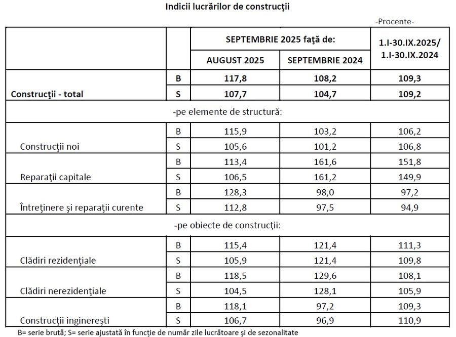 Datele INS releva faptul ca, in septembrie 2025 in raport cu septembrie 2024, volumul lucrarilor de constructii, ca serie bruta, a crescut, pe total, cu 8,2%, datorita proiectelor de reparatii capitale (+61,6%) si celor de constructii noi (+3,2%), in timp ce lucrarile de intretinere si reparatii curente au scazut cu 2%. In acest sens, pe obiecte de constructii, au fost raportate la cladirile nerezidentiale si la cladirile rezidentiale cu 29,6%, respectiv cu 21,4%. La polul opus s-au situat constructiile ingineresti, cu o scadere de 2,8%, de la un an la altul. Ca serie ajustata, in acelasi interval, lucrarile de constructii au crescut cu 4,7%, iar pe elemente de structura, evolutie evidentiata la lucrarile de reparatii capitale (+61,2%) si la constructiile noi (+1,2%). Lucrarile de intretinere si reparatii curente au scazut cu 2,5%. Pe obiecte de constructii, volumul lucrarilor de constructii s-a majorat in cazul cladirilor nerezidentiale (+28,1%) si in cel al cladirilor rezidentiale (+21,4%). O scadere de 3,1% s-a inregistrat la constructiile ingineresti.