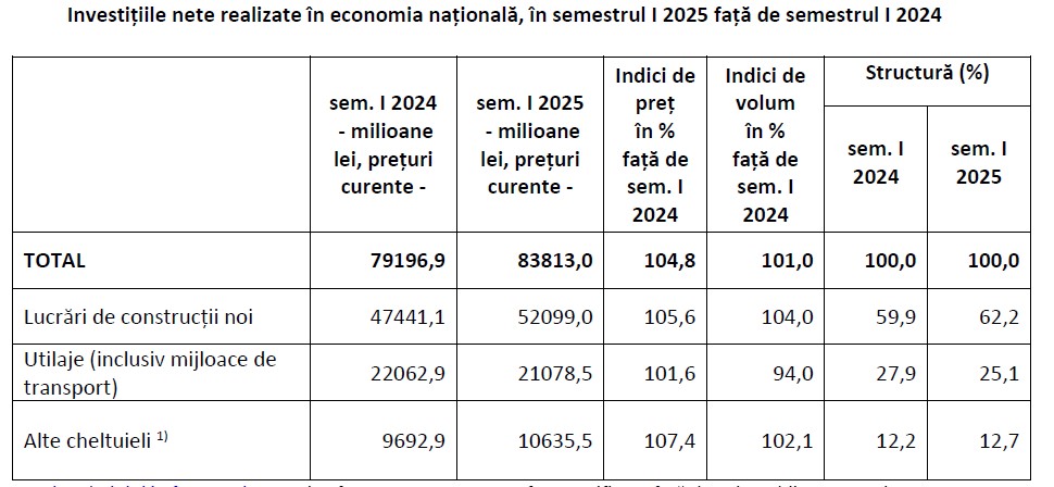 In primul semestru al anului 2025, investitiile nete realizate in economia nationala au insumat 83,81 miliarde lei (circa 16,5 miliarde euro), in crestere cu 1%, comparativ cu perioada corespunzatoare din 2024, potrivit celor mai recente date publicate de Institutul National de Statistica (INS). Din total, investitiile in lucrarile noi de constructii au crescut cu 4%, la 52 miliarde lei (peste 10 miliarde euro), iar cele in utilaje (inclusiv mijloace de transport) au scazut cu 6%, la 21 miliarde lei (4,1 miliarde euro). Sumele incluse la categoria "alte cheltuieli" au crescut, in semestrul I al acestui an, cu 2,1%, pana la peste 10,6 miliarde lei. Aici sunt calculate cheltuielile pentru lucrari geologice si de foraj, pentru cumpararea animalelor de munca, de productie si reproductie, plantatii de vita de vie, pomi, impaduriri, cheltuieli pentru achizitionarea obiectelor de inventar gospodaresc de natura mijloacelor fixe, cheltuieli pentru studiile de cercetare si proiectare legate de obiectivele de investitii si pentru serviciile aferente transferului de proprietate.