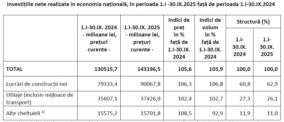 In primele 9 luni ale anului 2025, investitiile nete realizate in economia nationala au insumat 143,2 miliarde lei (circa 28,13 miliarde euro), in crestere cu 3,9%, comparativ cu perioada corespunzatoare din 2024, potrivit celor mai recente date publicate de Institutul National de Statistica (INS). Din total, investitiile in lucrarile noi de constructii au crescut cu 6,8%, la 90 miliarde lei (peste 17,6 miliarde euro), cele in utilaje (inclusiv mijloace de transport) s-au majorat cu 2,7%, la 37,4 miliarde lei (7,34 miliarde euro). Sumele incluse la categoria "alte cheltuieli" au scazut, in primele 9 luni ale acestui an, cu 7,1%, pana la 15,7 miliarde lei. Aici sunt calculate cheltuielile pentru lucrari geologice si de foraj, pentru cumpararea animalelor de munca, de productie si reproductie, plantatii de vita de vie, pomi, impaduriri, cheltuieli pentru achizitionarea obiectelor de inventar gospodaresc de natura mijloacelor fixe, cheltuieli pentru studiile de cercetare si proiectare legate de obiectivele de investitii si pentru serviciile aferente transferului de proprietate.