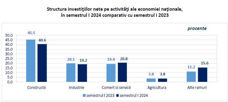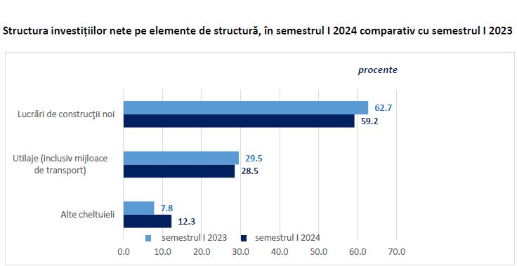 In semestrul I al anului 2024, investitiile nete realizate in economia nationala au insumat 80,26 miliarde lei, in crestere cu 5,6%, comparativ cu perioada corespunzatoare din 2023, potrivit datelor Institutului National de Statistica (INS). Cresteri au fost inregistrate, pe elemente de structura, pe indicatorul "alte cheltuieli" (+71,4%) si la utilaje (inclusiv mijloace de transport), cu 5,5%. Investitiile nete in lucrari de constructii noi au scazut cu 2,5%, in primul semestru.Pentru trimestrul al doilea al acestui an, datele INS indica investitii nete totale in economie de 45,75 miliarde lei, in crestere cu 5% comparativ cu cele trei luni corespunzatoare ale anului 2023. Evolutia a fost inregistrata la toate elementele de structura: utilaje (inclusiv mijloace de transport) cu 12%, la alte cheltuieli de investitii cu 4,4% si la lucrarile de constructii noi cu 2%.
