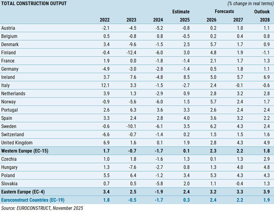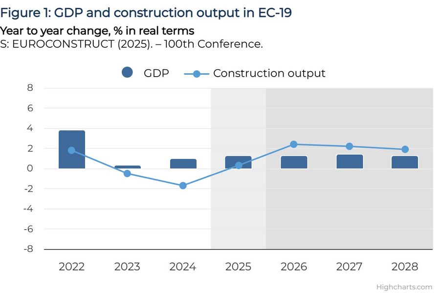 Dupa doi ani consecutivi de contractie, sectorul constructiilor din Europa intra intr-o faza de stabilizare prudenta. Conform celei mai recente prognoze, din noiembrie 2025, a retelei Euroconstruct, productia totala in constructii in cele 19 tari membre a scazut cu 0,5% in 2023 si cu 1,7% in 2024, marcand cea mai slaba performanta pentru doi ani consecutivi, dupa pandemie. Totusi, perspectivele se schimba: este asteptata o crestere modesta, de 0,3%, in 2025, urmata de o expansiune mai vizibila, de 2,4% in 2026, pe masura ce conditiile de finantare se imbunatatesc si ingineria civila/ infrastructura devine principalul motor al redresarii.Conform Euroconstruct, fundamentele economice raman mixte. Desi ratele dobanzilor au scazut fata de varfurile din 2023, iar inflatia s-a moderat in Europa, iar activitatea din constructii continua sa se confrunte cu provocari precum costuri ridicate de constructie, constrangeri de finantare, investitii private reduse si incertitudine macroeconomica persistenta. Aceste presiuni apasa cel mai mult asupra constructiilor de cladiri, in special asupra segmentului rezidential, care ramane principalul factor de franare a cresterii generale. "Productia de locuinte noi a scazut in 2023 si in 2024. O redresare reala se va materializa abia in 2027. Renovarea rezidentiala, de asemenea slabita in 2024, este de asteptat sa scada din nou in 2025 inainte de a reveni la o crestere modesta in anii urmatori. Acest lucru confirma un tipar structural: renovarea ramane rezilienta, dar nu mai ofera sprijin anticiclic puternic, asa cum s-a intamplat in anii boom-ului eficientei energetice", se arata in analiza Euroconstruct.