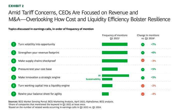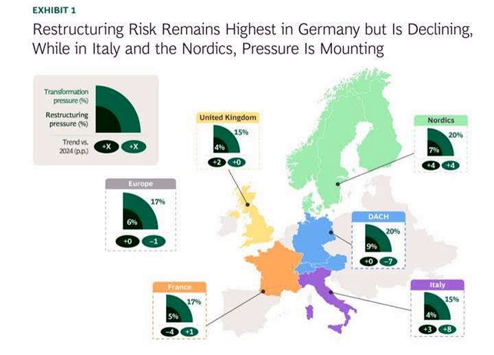 Tensiunile comerciale, socurile geopolitice si tarifele vamale continua sa fie o preocupare majora pentru companiile europene. Potrivit celui de-al treilea Index Transformare si Situatii Speciale (TSS) realizat de BCG, care acopera 1.700 de companii europene listate, 17% dintre companii se afla sub presiune semnificativa de transformare, iar 6% necesita restructurare. Aceste companii reprezinta peste 300 miliarde dolari din PIB si 3,5 milioane de locuri de munca.Context si perspective