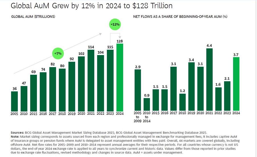 Industria globala de asset management a crescut in 2024 la un nivel record de 128 de trilioane de dolari in active aflate in administrare (AuM), cu 12% mai mult fata de anul precedent, conform raportului Global Asset Management 2025, editia a 23-a, publicata de Boston Consulting Group (BCG). Aceasta performanta marcheaza o redresare fata de scaderea suferita in 2022, insa ascunde presiuni structurale tot mai mari care impun o reinventare urgenta.Raportul din acest an, intitulat „De la redresare la reinventare”, arata ca peste 70% din cei 58 de miliarde de dolari in crestere a veniturilor din 2024 au fost generati de performanta pietei, si nu de fluxurile nete de capital, subliniind vulnerabilitatea industriei in fata fortelor externe. In acelasi timp, comprimarea constanta a comisioanelor, schimbarile in preferintele investitorilor si transformarea digitala determina companiile sa isi regandeasca modelele de afaceri, sa accelereze inovatia in materie de costuri si sa isi consolideze focusul strategic.