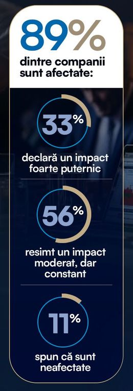 89% dintre companii resimt un impact negativ: 33% descriu situatia drept "foarte puternica", iar 56% vorbesc despre un impact moderat, dar constant, care le afecteaza planurile si le consuma resursele interne.