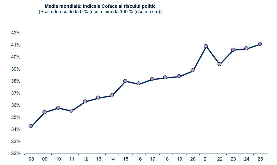 Indicele Coface al riscului social si politic a atins un nivel istoric de 41,1%, depasind varful pandemiei si stabilind riscul politic ca un parametru structural cheie al economiei globale.