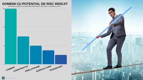 Din punct de vedere al riscului investitional, in prim-plan se vor afla afacerile din comert, acolo unde, si in 2019, au fost cele mai multe probleme. 28.114 firme de profil au fost radiate, 3.954 de companii si-au suspendat activitatea, iar 1.800 au intrat in insolventa in primele 11 luni din 2019.