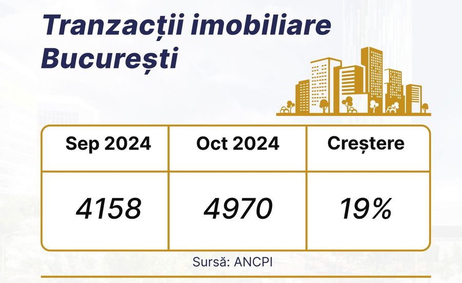 Potrivit datelor furnizate de Agentia Nationala de Cadastru si Publicitate Imobiliara (ANCPI), in luna octombrie 2024 s-au vandut in Capitala cu 19,5% mai multe locuinte fata de luna precedenta, mai exact 4.970 de imobile, comparativ cu 4.158 de unitati cumparate in luna septembrie 2024. "Piata imobiliara din Bucuresti continua sa inregistreze cresteri in vanzari in fiecare luna, iar datele oficiale reflecta o cerere puternica in special de locuinte noi si un interes crescut pentru investitorii care fac achizitii imobiliare in scopul obtinerii de randamente atractive din operatiunile de inchiriere sau revanzare", declara Vlad Musteata, CEO North Bucharest Investments.