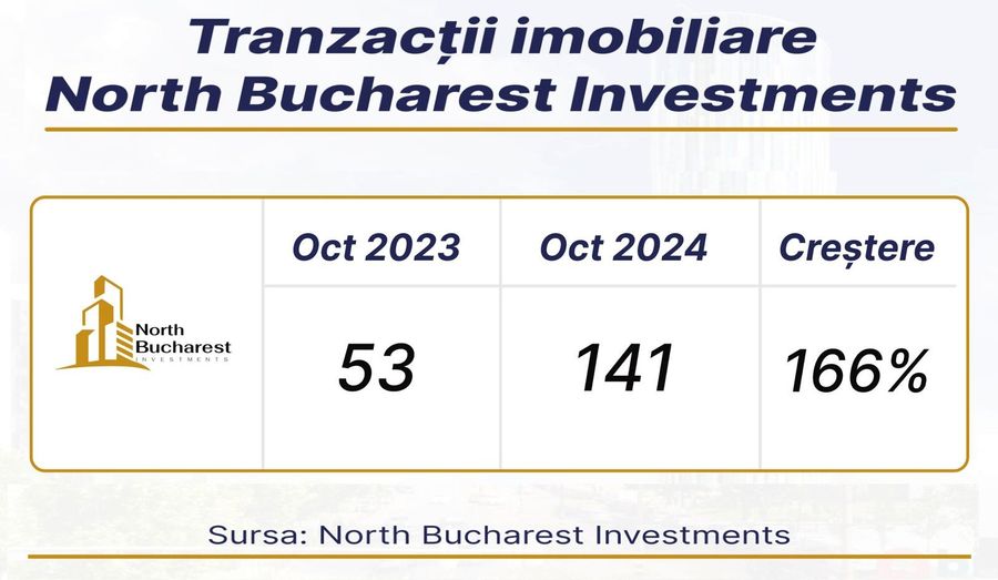 In acest context de crestere generala a pietei, North Bucharest Investments a raportat pentru luna octombrie 2024 un total de 141 de tranzactii, cu o valoare cumulata de 21,9 milioane de euro. Comparativ cu luna septembrie 2024, cand au fost efectuate 134 de tranzactii, in valoare de 18,5 milioane de euro, North Bucharest Investments a inregistrat o crestere lunara de 5,2% in numarul tranzactiilor si de 18,2% in valoarea acestora.