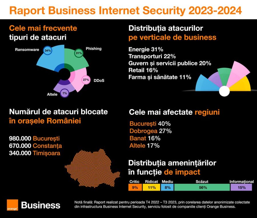 Conform raportului realizat de expertii Orange Business ce au analizat peste 11 milioane de amenintari identificate lunar de serviciul Business Internet Security, a fost observata o crestere constanta a numarului de atacuri cibernetice. Analiza datelor din acest an a aratat ca sectorul energetic a fost cel mai afectat, inregistrand 31% din totalul atacurilor, urmat de transporturi cu peste 22%, sectorul guvernamental si cel al serviciilor publice cu 19%, retail cu 19,7% si cel de sanatate cu peste 10%.