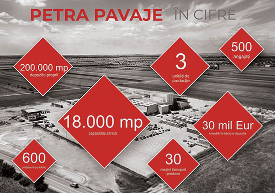 - Programul este o oportunitate excelenta pentru companiile care doresc sa-si infiinteze/ dezvolte capacitatile de productie pentru materialele de constructii sau sa-si imbunatateasca eficienta energetica. Recent, am realizat investitii considerabile in extinderea productiei, prin punerea in functiune a celei de-a patra unitati de productie Petra Pavaje. Cele 4 fabrici dispun de o capacitate zilnica de productie de pana la 24.000 mp.