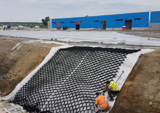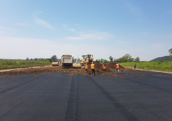 · S-a decis introducerea a 2,2 milioane mp de geogrila triaxiala TriAx® TX150 in fundatia de balast, pentru a forma un strat stabilizat mecanic si geotextil cu rol de filtrare si separare.