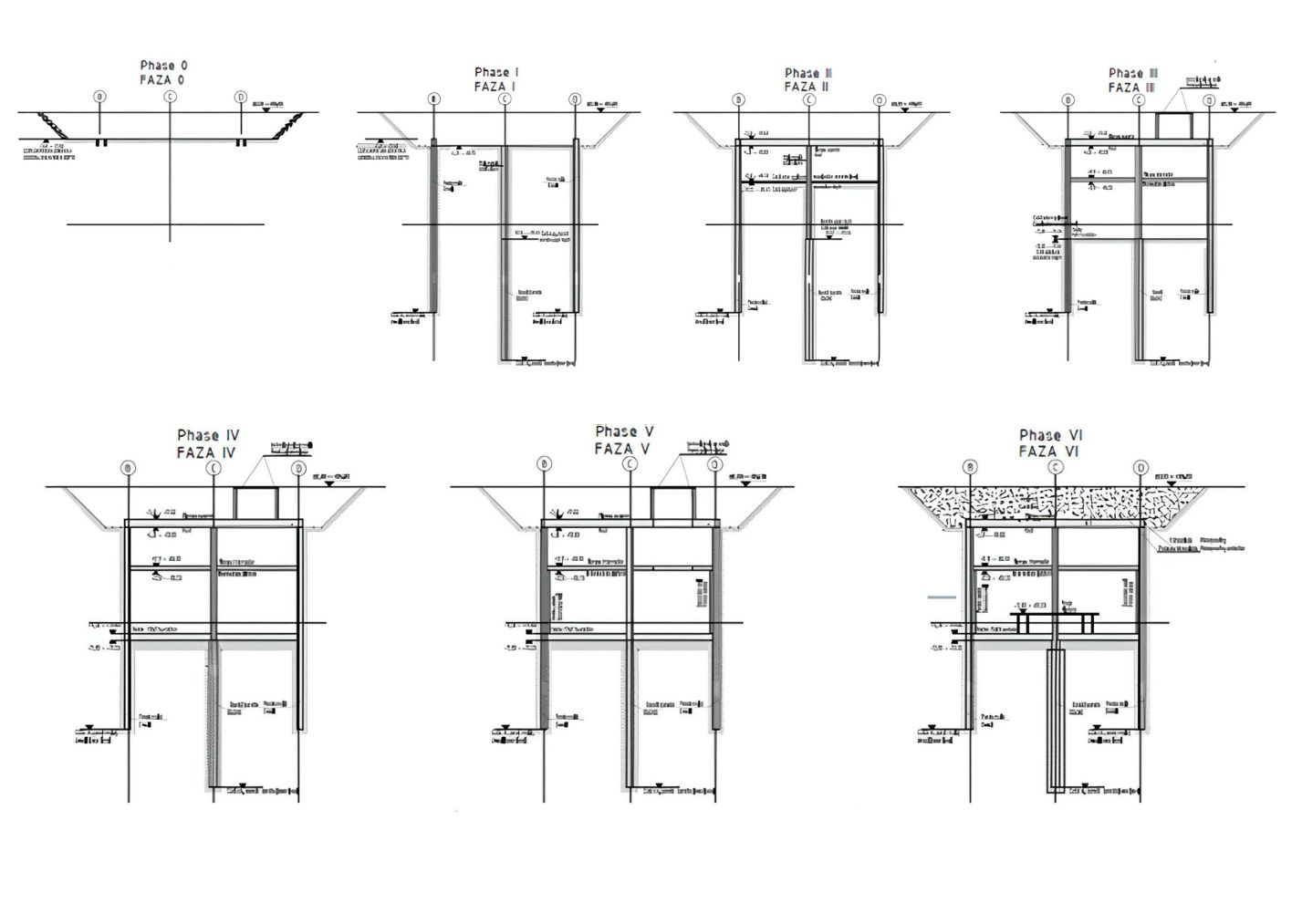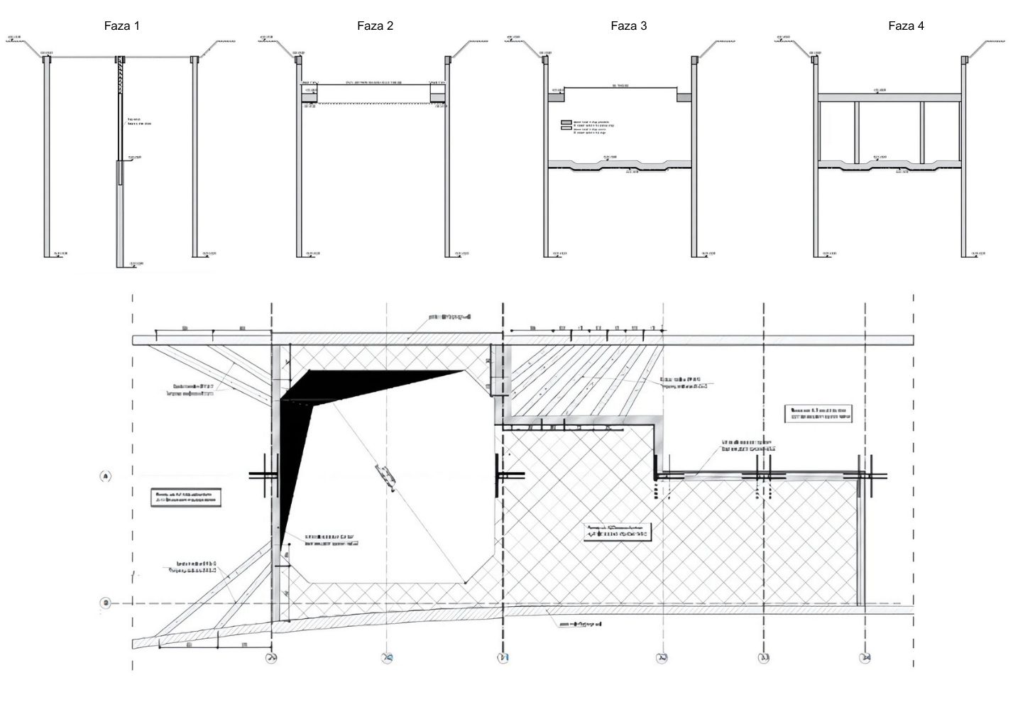In proiectarea statiilor Paris, Bruxelles si Otopeni, inginerii de structura de la Concept Structure au implementat o solutie tehnica inovatoare pentru aceasta metoda: utilizarea stalpilor prefabricati din beton armat instalati in subteran odata cu executia baretelor. Practic, in locul stalpilor metalici provizorii (adesea folositi ca sprijiniri temporare la metoda top-down), s-au introdus stalpi prefabricati de beton in carcasa armaturii beretelor, care au fost ulterior betonati monolit integrat. Acesti stalpi prefabricati devin parte a structurii finale si servesc la sprijinirea imediata a planseelor pe parcursul constructiei, eliminand necesitatea unor elemente metalice temporare si accelerand procesul de executie. Betonul utilizat pentru elementele monolite este de clasa C30/37, iar pentru elementele prefabricate s-a folosit beton de clasa superioara C40/50, asigurand atat rezistenta necesara, cat si durabilitatea in mediul subteran. Aceasta abordare optimizeaza santierul din punct de vedere structural si economic, reducand timpii de asteptare si marind siguranta in executie (mai putine faze de substituire a sprijinirilor provizorii).