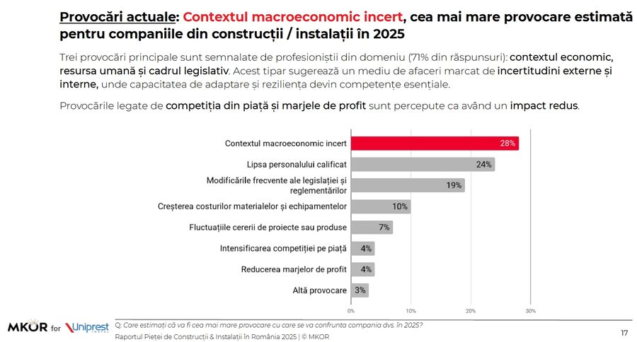 Pesimismul si moderatia formeaza concluzia studiului "Piata de Constructii & Instalatii in Romania, 2025", realizat de Uniprest Instal si MKOR, care ofera o imagine de ansamblu a pietei de constructii si instalatii, tendintele, provocarile si perspectivele expertilor in industrie din acest an. Situatia macroeconomica volatila din prezent si instabilitatea globala sunt principalele motive pentru care antreprenorii si managerii din acest sector privesc anul in curs cu garda pusa. Ca in majoritatea pietelor, lipsa personalului calificat e una dintre principalele ingrijorari, insa aici - in mod surprinzator, aceasta concureaza pentru locul 1 in topul temerilor cu situatia economica si geopolitica. Astfel, acestea se traduc in piata prin viziunea pesimista (48%) si moderatia cu care este privita evolutia pietei de constructii si instalatii pentru anul in curs.