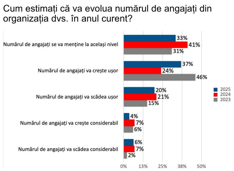 Piata fortei de munca se transforma treptat. Doar 33% dintre companii mai mizeaza pe mentinerea nivelului actual de personal (fata de 41% in 2024), majoritatea optand pentru ajustari moderate si cresteri graduale.