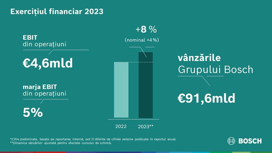 Grupul Bosch si-a indeplinit asteptarile, in ciuda provocarilor din exercitiul financiar 2023: conform cifrelor preliminare, furnizorul de tehnologie si servicii, a generat1 vanzari de 91,6 miliarde de euro si, astfel, a inregistrat o crestere de 8 procente dupa ajustarea efectelor cursului de schimb valutar (crestere nominala de 4 procente). Marja EBIT din operatiuni a ajuns la 5 procente, o usoara imbunatatire fata de anul precedent (4,3 procente), indeplinind astfel asteptarile. „Pentru Bosch, anul 2023 a fost mai greu decat se anticipa. Printr-un efort suprem, am reusit sa ne crestem vanzarile si sa ne imbunatatim marjele. Am facut progrese in ciuda dificultatilor intampinate”, a declarat Dr. Stefan Hartung, presedintele consiliului de administratie al Robert Bosch GmbH, cu ocazia prezentarii cifrelor de afaceri preliminare ale companiei. "Avand in vedere conditiile dificile, aceasta este o realizare impresionanta a angajatilor nostri. Anii urmatori vor presupune mai multe eforturi colective”. In ultimul exercitiu financiar, Bosch a reusit sa isi extinda in continuare domeniile de crestere, sa avanseze in transformarea activitatii sale de mobilitate si sa consolideze competitivitatea tuturor domeniilor sale de activitate. „Continuam sa investim in mod proactiv in tehnologiile care vor modela viitorul - in special in tehnologiile legate de actiunile climatice. Cu toate acestea, observam o intarziere in patrunderea pe piata a acestor tehnologii, iar dinamica pietei a incetinit. Trebuie sa reactionam la situatia mai slaba a comenzilor si sa lucram din greu la competitivitatea noastra - doar asa ne putem finanta cresterea viitoare”. Avand in vedere aceste circumstante, Bosch se asteapta sa fie necesara o ajustare in mai multe domenii, precum sectorul de activitate Mobilitate. Acesta din urma a intrat recent in discutii pe aceasta tema cu reprezentantii angajatilor. Orice ajustare necesara a personalului ar trebui sa fie cat mai acceptabila din punct de vedere social. In conformitate cu acordul de munca incheiat cu reprezentantii angajatilor in vara anului 2023 pentru locatiile sectorului Mobilitate din Germania, disponibilizarile nu sunt prevazute pana la sfarsitul anului 2027. „Schimbarea poate avea succes doar prin parteneriat social. De asemenea, ne asumam angajamentul fata de Germania ca locatie industriala si, in special, ca locatie de productie”, a declarat Hartung. In plus, Bosch doreste sa continue recrutarea in sectoare de activitate deosebit de promitatoare si sa recalifice cat mai multi angajati pentru a-i muta din domeniile in scadere in cele in crestere. Pana in 2030, compania intentioneaza sa cheltuiasca in total aproximativ 4 miliarde de euro pentru formare si recalificare. Acest lucru va necesita, de asemenea, disponibilitate din partea angajatilor.