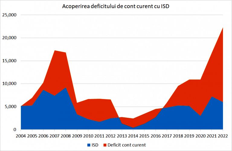 Graficul de jos arata masura in care investitiile straine directe (ISD) acopera deficitul de cont curent. Asa cum se observa, gradul de acoperire prezent este chiar mai mic decat valoarea deja redusa din pragul crizei din 2008, ca urmare a unui proces rapid de deteriorare. Problema este ca ISD sunt sursele cele mai stabile de finantare a deficitului. Scaderea gradului de acoperire de catre ISD la sub 30% sugereaza ca restul este realizat de imprumuturi externe si investitii de portofoliu, adica finantari care tin de apetitul investitorilor de portofoliu de a finanta o tara precum Romania.