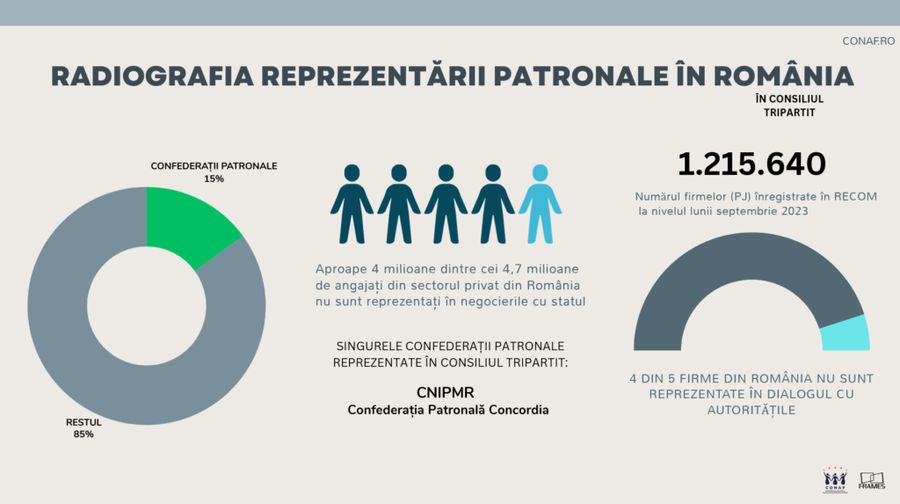 In timp ce sindicatele sunt reprezentate de numai putin de 5 confederatii in cadrul Consiliului Tripartit (guvern/sindicate/patronate) – mediul privat este sustinut de numai doua confederatii (Concordia si CNIPMMR) care impreuna reprezinta in jur de 15% din totalul celor 4,7 milioane de salariati din sectorul privat/patroni din Romania.