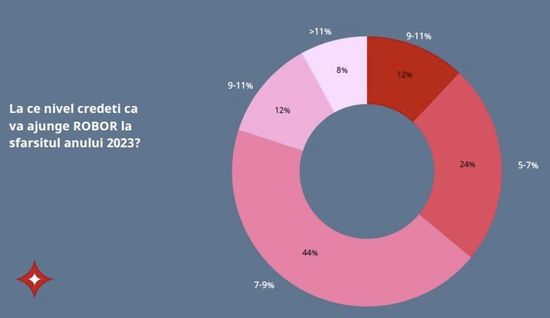 Pana atunci, insa, cei mai multi se asteapta ca finantarea sa fie extrem de scumpa, cu un ROBOR estimat in intervalul 7-9% de 44% dintre intervievati. 12% dintre respondenti se asteapta la un ROBOR intre 9-11%, iar alti 8% la un nivel de peste 11%. Doar 36% dintre executivi anticipeaza un nivel al ROBOR <7% pentru finalul anului 2023.