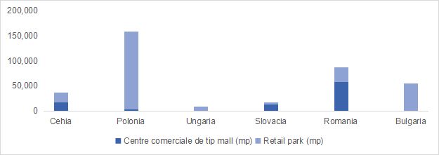 In total in Europa Centrala si de Est au fost livrati 360.000 metri patrati de spatii de retail, din care aproape 80% (274.000 metri patrati) reprezinta proiecte de tip retail park. Doar 85.000 de metri patrati de spatii de tip mall au fost livrate in regiune in aceasta perioada, cea mai mare suprafata fiind construita in Romania (60% din total).