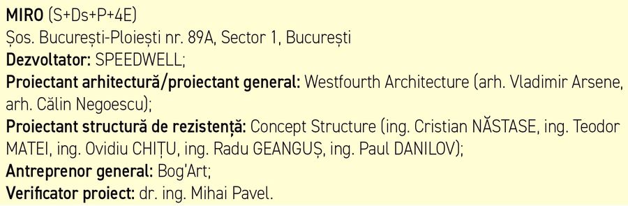 Complexul de birouri MIRO a fost dezvoltat de grupul belgian Speedwell in zona de nord a Capitalei, pe Soseaua Bucuresti - Ploiesti nr. 89A, in Sectorul 1. Cladirea beneficiaza de avantajele unei vizibilitati ridicate, acces facil si ofera birouri clasa A, detinand certificari BREEAM EXCELLENT si WELL, pe langa o serie de facilitati concepute pentru confortul angajatilor. Din punct de vedere al functionalitatii, zona de suprastructura se realizeaza ca spatiu de birouri, iar demisolul si subsolul sunt ocupate de spatii de parcare, tehnice, pentru depozitare, zona ALA si rezervoare. Corpul Parter este reprezentat de o platforma de acces in cele doua cladiri, ansamblul fiind constituit din doua corpuri cu functiunea de birouri si regimuri de inaltime S partial+Ds+P+4E si S+Ds+P+4E, respectiv o zona interioara comuna, reprezentata de platforma de acces in cladiri si un spatiu pentru parcare, cu regimul de inaltime Parter. Lucrarile de constructii au inceput in iulie 2020 si au fost finalizate la sfarsitul anului 2021.![]() Concept Structure a proiectat structura de rezistenta a celor doua cladiri din pereti independenti si cadru perimetral de beton armat. Acestea au o inaltime de 35 de metri si o suprafata construita totala de 35.000 mp. Pentru a respecta cerintele arhitecturale si a permite o eficienta din punct de vedere al spatiului util folosit, s-a adoptat o solutie cu betoane de inalta rezistenta - beton clasa de rezistenta C60/75, rezultand, astfel, pereti zvelti din beton armat cu o rezistenta mare la compresiune si la forte laterale seismice. A fost pentru prima data in Romania cand s-a folosit clasa de beton C60/75, produs si livrat de Holcim Romania si pus in opera de Bog’Art.
