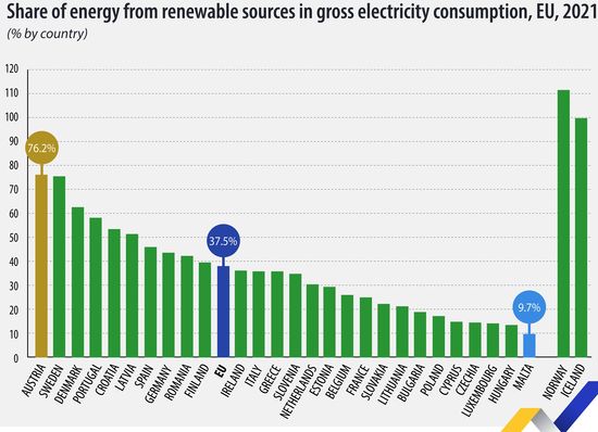 Topul tarilor cu cel mai mare consum de energie din surse regenerabile este condus de Austria (76,2%), urmata de Suedia (peste 75%) si Danemarca, fiind completat de Portugalia si Croatia.