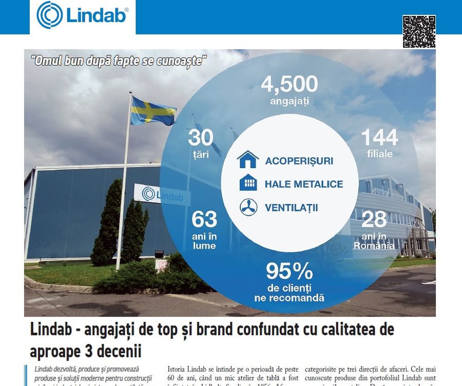 Revista continua cu un Cover Story, material ce prezinta povestea Lindab Romania, parte a grupului suedez Lindab, ce dezvolta, produce si promoveaza produse si solutii moderne pentru constructii civile si industriale si sisteme de ventilatii pentru un climat interior imbunatatit, bazat pe un concept si o strategie proprie de afaceri. Materialul prezinta, pe scurt, principalele repere ale celor 60 de ani de activitate globala Lindab, precum si directiile de activitate ale subsidiarei din Romania. Materialul include o opinie a Cameliei Popescu, Manager Marketing si Comunicare la Lindab Romania, pe tema resursei celei mai importante a companiei - oamenii, prezentarea solutiei Lindab de ventilatie mecanica pentru asigurarea unui aer curat in scoli, precum si un interviu cu Andrei Sulyok, directorul general al Lindab Romania, referitor la activitatea din primele sase luni ale anului si perspectivele pentru perioada urmatoare pentru toate cele 3 segmente de business pe care le are in Romania (acoperisuri metalice, constructii de hale si ventilatii).