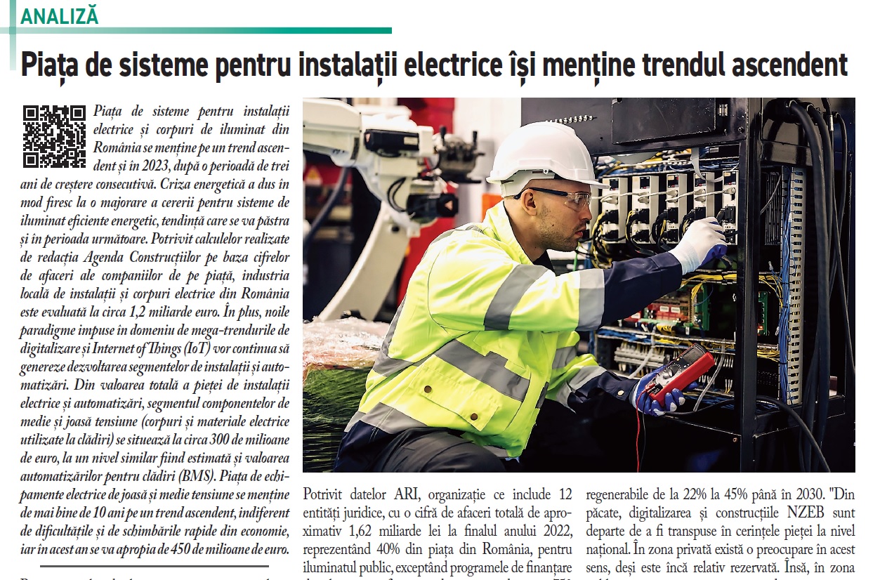In continuare, tot la rubrica de Analiza este publicat si un material referitor la perspectivele pietei locale de instalatii electrice si automatizari, in contextul noilor exigente privind eficienta energetica si accelerarea proceselor de digitalizare. Articolul include o scurta prezentare a pietei, ca valoare, segmentare si volum, precum si perspectivele de dezvoltare date de noile exigente impuse de constructiile NZEB si ale utilizarii de energie verde. De asemenea, este inclusa, in premiera, si o analiza a pietei de panouri fotovoltaice. Analiza a fost realizata cu ajutorul unor reprezentanti de marca pentru piata de echipamente si instalatii electrice, automatizari si panouri fotovoltaice, precum:
