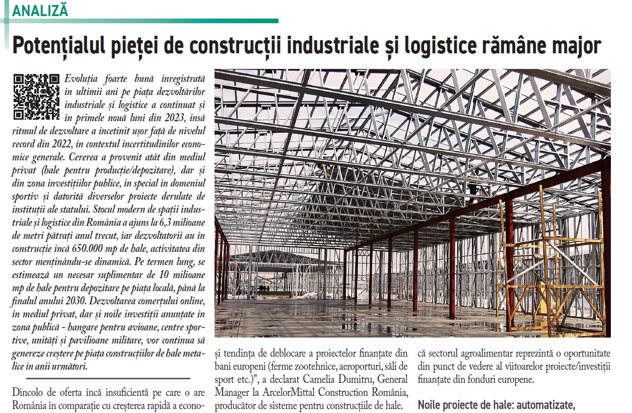 Primul material al revistei este reprezentat de Analiza pietei locale de constructii industriale si logistice, segment care a inregistrat o evolutie foarte buna in ultimii ani. Stocul modern de spatii industriale si logistice din Romania a ajuns la 6,3 milioane de metri patrati anul trecut, iar dezvoltatorii au in constructie inca 650.000 mp de hale, activitatea din sector mentinandu-se dinamica. Pe termen lung, se estimeaza un necesar suplimentar de 10 milioane mp de hale pentru depozitare pe piata locala, pana la finalul anului 2030. Analiza include date referitoare la domeniile generatoare de cerere pentru constructiile industriale, informatii despre noile proiecte de hale, certificari si tendinte de proiectare/ design/ eficienta energetica, evolutia preturilor din domeniu, precum si despre produsele si sistemele dedicate constructiei de hale.