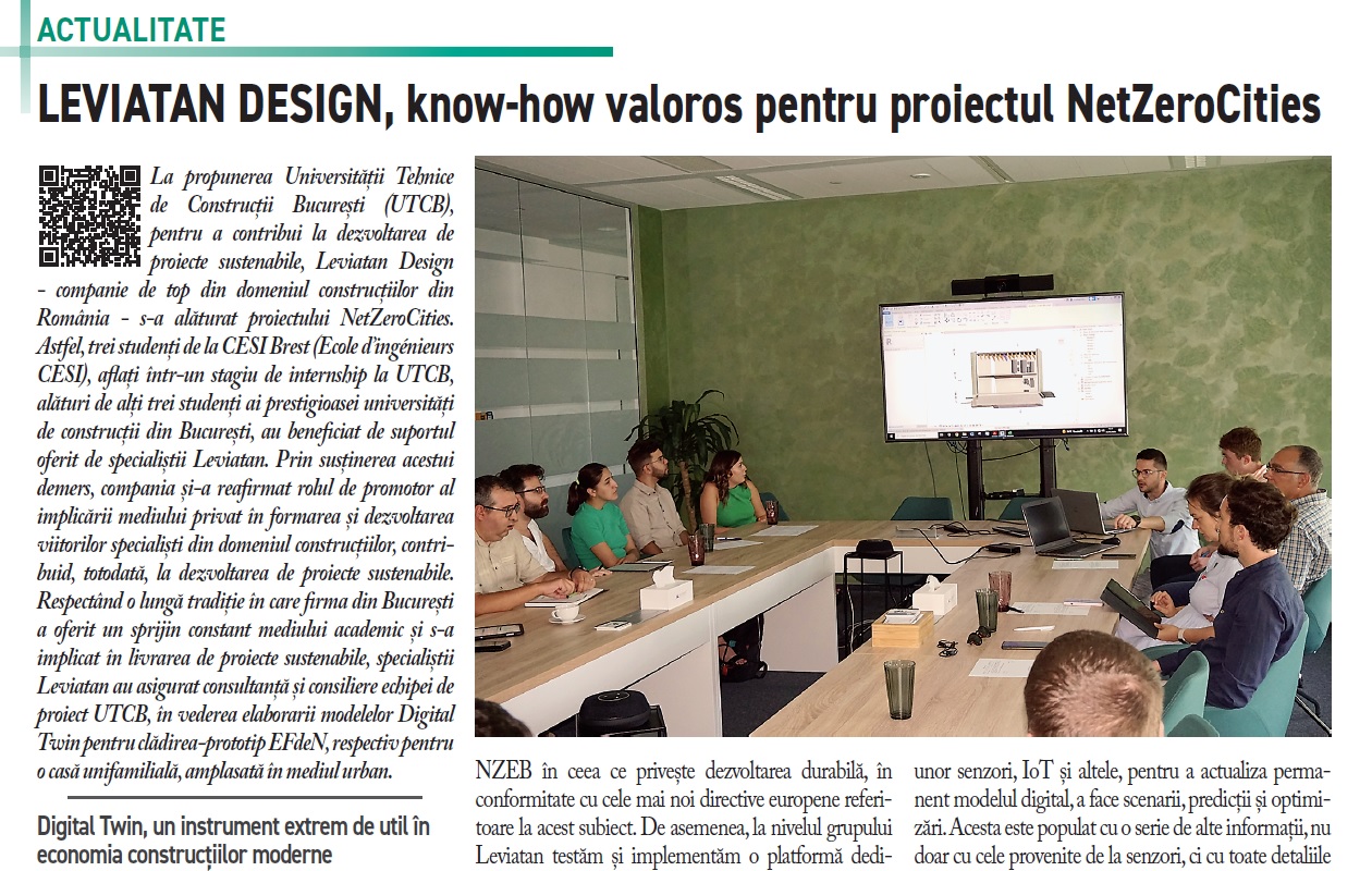 In continuare, la rubrica de Actualitate sunt publicate articole pe diverse tamtici, legate de realizari, proiecte sau rezultate ale unor companii din domeniul constructiilor. Primul dintre acestea se refera la aportul de cercetare in domeniul noilor tehnologii digitale si eficiente utilizate de Leviatan Design, companie ce s-a alaturat proiectului NetZeroCities, prin care si-a reafirmat rolul de promotor al implicarii mediului privat in formarea si dezvoltarea viitorilor specialisti din domeniul constructiilor.