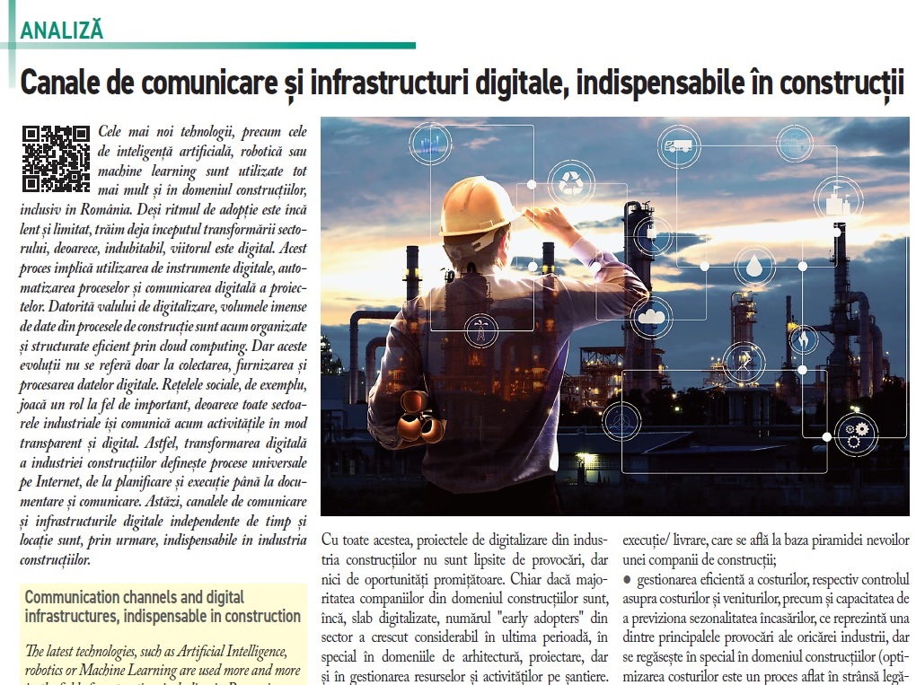 Revista continua cu o Analiza pe tema industriei de software dedicat sectorului de proiectare si constructii, dar nu numai, in noul context marcat de digitalizare intensiva a intregii economii. Materialul porneste cu o prezentare a tendintelor actuale marcante in acest domeniu, marcheaza principalele evolutii ale adoptiei BIM in Romania, face referire la finantarile disponibile pentru digitalizarea companiilor si se incheie cu opinii ale reprezentantilor unor furnizori de marca de sisteme informatice dedicate: