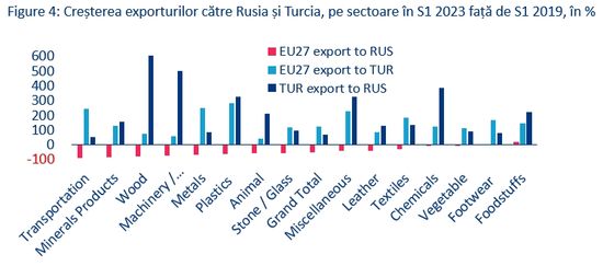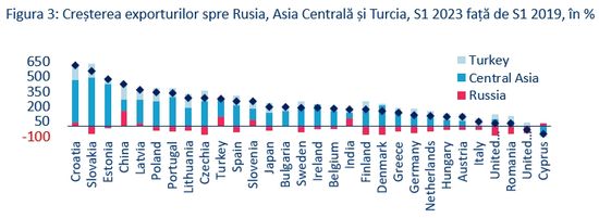 Exporturile UE catre Turcia, de exemplu, au crescut in medie cu +58,1% intre primul semestru din 2019 si 2023. Cifrele sunt si mai izbitoare pentru economiile din Asia Centrala: valorile exporturilor UE catre Kazahstan au crescut cu +100%, catre Kargazstan cu un + 800%, catre Tadjikistan cu +151%, catre Turkmenistan cu +78,5% si catre Uzbekistan cu +66,6% in aceeasi perioada. In plus, exporturile turcesti catre Rusia s-au situat la 0,4 miliarde USD in 2019 si au crescut la 0,9 miliarde USD in 2022. In mod similar, in Asia Centrala, exporturile catre Rusia au crescut cu +53,8% de la 0,8 miliarde USD in 2019 la 1,2 miliarde USD in 2022. Schimbarile notabile ale modelelor comerciale reprezinta o adevarata deturnare a comertului. Majoritatea tarilor occidentale – cu exceptia Croatiei, Letoniei, Sloveniei si Ciprului – si-au redus drastic exporturile directe catre Rusia, in timp ce altele precum China, India sau Turcia le-au crescut. Dar exporturile catre Rusia prin Asia Centrala sau Turcia au crescut peste tot - cu exceptia Ciprului.