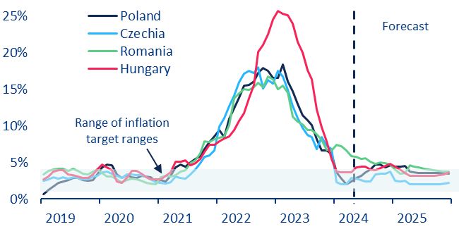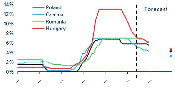 Si Cehia a redus rata de politica monetara cu un total de 175bps in ultimele sase luni, dar va incetini ciclul de relaxare monetara cu o scadere cumulata de 100bps, ajungand la 4,25% la finalul anului 2024. Ungaria a inregistrat pana in prezent sapte reduceri de rata totalizand 525bps din octombrie 2023, dar ciclul de relaxare a fost deja incetinit in aprilie. In 2025 sunt prognozate reduceri moderate ale ratelor in intreaga regiune, in linie cu scaderea inflatiei, insa ratele de politica monetara vor fi probabil mai ridicate la finalul anului viitor.