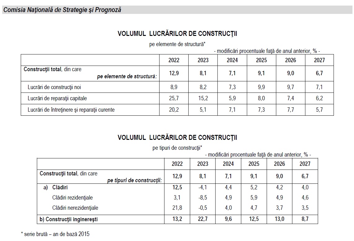 Prognoza de toamna a CNSP indica o crestere bruta de 8,1% a volumului lucrarilor de constructii in 2023, dinamica fiind estimata sa se reduca usor in 2024, in linie cu evolutia PIB, cand ar putea fi inregistrata o majorare de 7,1%. Activitatea din sector ar urma, insa, sa se intensifice in 2025 si 2026 (+9,1%, respectiv +9%) - pe fondul investitiilor masive finantate cu precadere din PNRR, dar si din celelalte programe operationale europene si nationale, urmand ca apoi dinamica sa se reduca in 2027, la +6,7%. Pe elemente de structura, productia din constructii va inregistra, in 2023 o crestere de 8,2% la constructiile noi, de +15,2% la lucrarile de reparatii capitale si de +5,1% la cele de intretinere si reparatii curente. Pentru 2024, estimarile indica majorari pe toate segmentele, respectiv +7,3% la constructiile noi, +5,9% la lucrarile de reparatii capitale si +7,1% la cele de intretinere si reparatii curente.