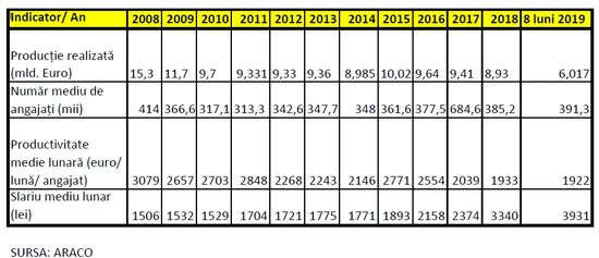 Conform datelor ARACO, la finele lunii august 2019, in sectorul de constructii lucrau 391.300 de persoane, cu 1,6% mai multe fata de nivelul de 385.200 inregistrat in decembrie 2018, dar inca sub cel de 414.000 cate angaja in 2008, in perioada de varf a sectorului. In ceea ce priveste productivitatea medie lunara din domeniu, cifrele indica continuarea scaderii acesteia, in 2019 indicatorul respectiv ajungand la 1.922 de euro/ luna/ angajat, fata de 1.933 de euro/ luna/ angajat in 2018, 2.039 de euro/ luna/ angajat in 2017, 2.554 de euro/ luna/ angajat in 2016 si 2.771 euro/ luna/ angajat in 2015.