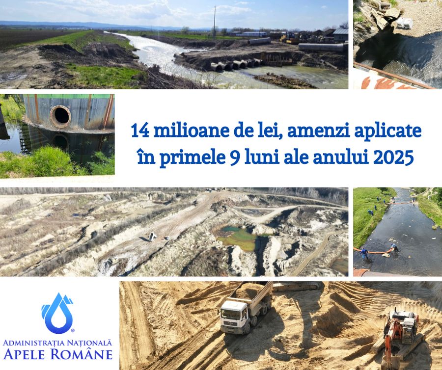 In perioada ianuarie - septembrie 2025, Inspectia Nationala a Apelor, structura din cadrul Administratiei Nationale "Apele Romane" (ANAR), a desfasurat o ampla activitate de inspectie si control la nivel national, avand ca obiectiv principal verificarea modului de respectare a legislatiei din domeniul gospodaririi apelor.Astfel, in primele 9 luni ale anului, au fost efectuate 6.415 controale, in urma carora au fost aplicate 970 de sanctiuni principale, dintre care 465 avertismente si 505 amenzi, in valoare totala de aproape 14 milioane de lei.