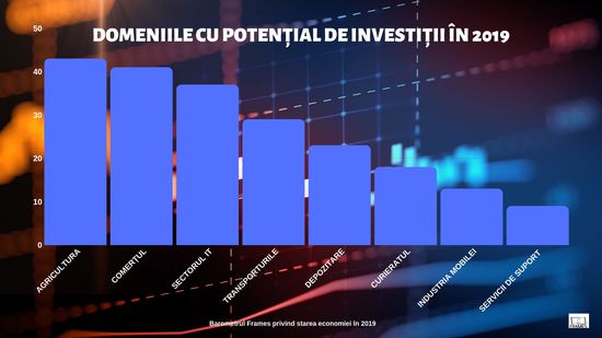 Dincolo de temerile privind cadrul macro-economic, Barometrul Frames indica si domeniile cu potential investitional din 2019, asa cum reies din estimarile oamenilor de afaceri. Intrebati care sunt sectoarele care vor aduce profit in acest an, cei mai multi manageri au indicat agricultura (43%), comertul (41%), sectorul IT (37%) si transporturile (29%).