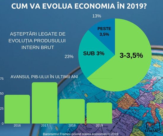 Accentuarea blocajului financiar, cresterea fiscalitatii si evolutia negativa a cursului de schimb reprezinta principalele temeri ale investitorilor la inceput de an. Potrivit unui barometru realizat de compania de consultanta Frames, 2019 se anunta a fi anul provocarilor, evolutia pozitiva a economiei fiind pusa sub semnul intrebarii, printre altele, de modificarile fiscale, de preconizata scumpire si restrangere a finantarii bancare si de scaderea semnificativa a apetitului pentru investitii.Economia romaneasca va continua sa creasca in 2019, insa ritmul va fi unul mai redus fata de 2018, estimeaza reprezentantii mediului de business. 64% dintre cei chestionati de compania de consultanta Frames in cadrul "Barometrului privind starea economiei" au indicat un avans al PIB-ului intre 3 si 3,5%, in timp cel 23% au estimat o crestere economica sub nivelul de 3%. Numai 13% dintre respondenti au estimat o crestere PIB peste nivelul de 3,5%.