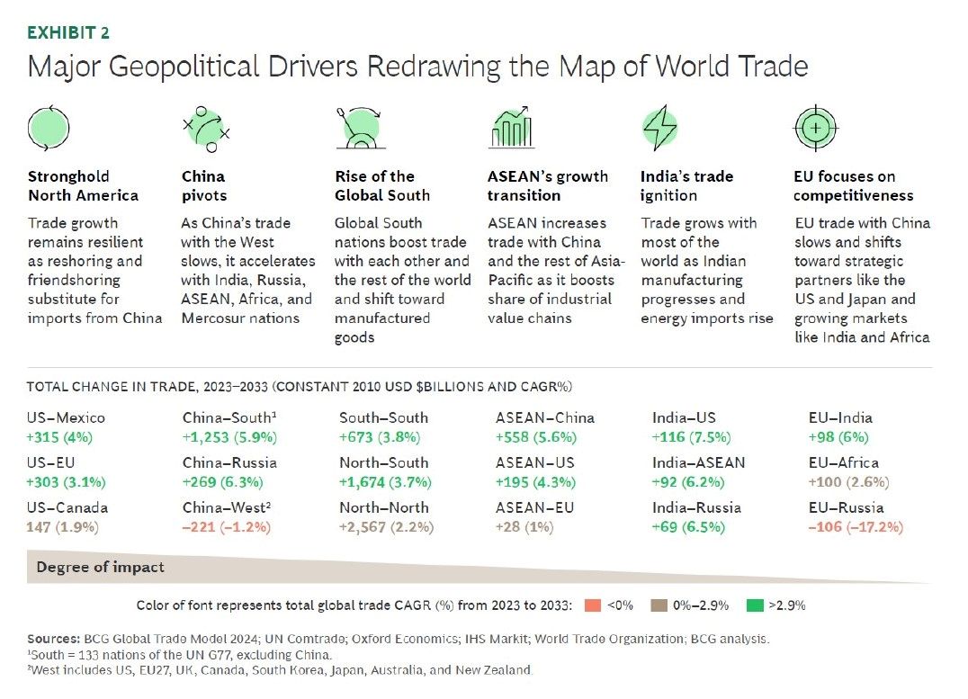 Rivalitatile geopolitice rescriu economia globala si vor continua sa o faca si in anii urmatori, influentata de tarifele impuse de SUA asupra importurilor. Fara o crestere generalizata a tarifelor, comertul mondial cu bunuri va continua sa creasca cu o medie anuala de 2,9% in urmatorii opt ani. Cu toate acestea, rutele comerciale vor suferi transformari majore: America de Nord isi va reduce dependenta de China, in timp ce China isi va intari relatiile cu Sudul Global, care devine tot mai influent pe scena comertului international.Acestea sunt principalele concluzii ale raportului "Marile Puteri, Geopolitica si Viitorul Comertului", publicat recent de Centrul pentru Geopolitica al Boston Consulting Group.
